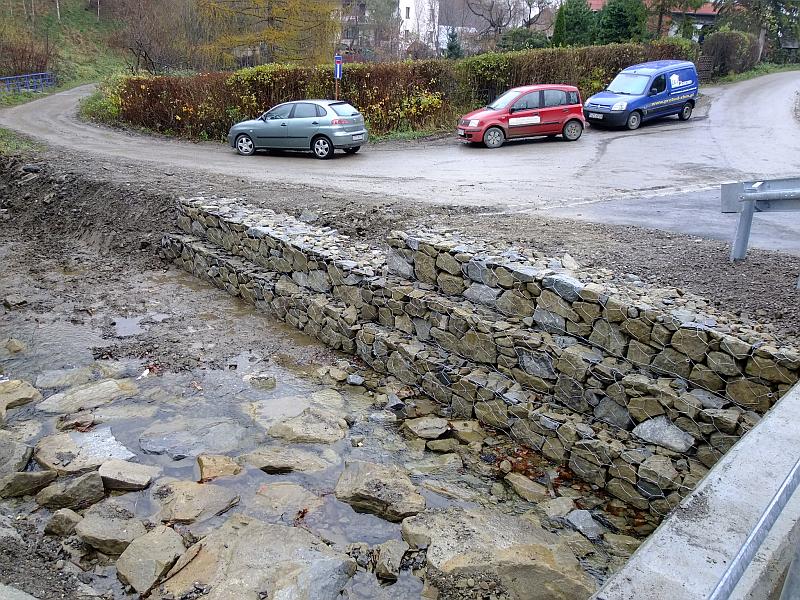 Zadanie polegało na rozbiórce istniejącego betonowego przepustu fi 1,2m oraz budowie nowego mostu na bazie przepustu ramowego z prefabrykatów o świetle 3,00m x 1,5m i długości I=8,00m wraz z przeprofilowaniem najazdów i zjazdów na most, umocnieniem dna i brzegów od strony wody dolnej oraz przeprofilowaniem kształtu istniejących murów od strony wody górnej.