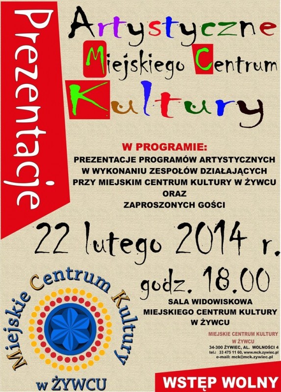 Zapraszamy na Prezentacje Artystyczne Miejskiego Centrum Kultury w Żywcu, już 22 lutego o godz. 18:00 w sali widowiskowej MCK przy Al. Wolności 4. Wstęp wolny.