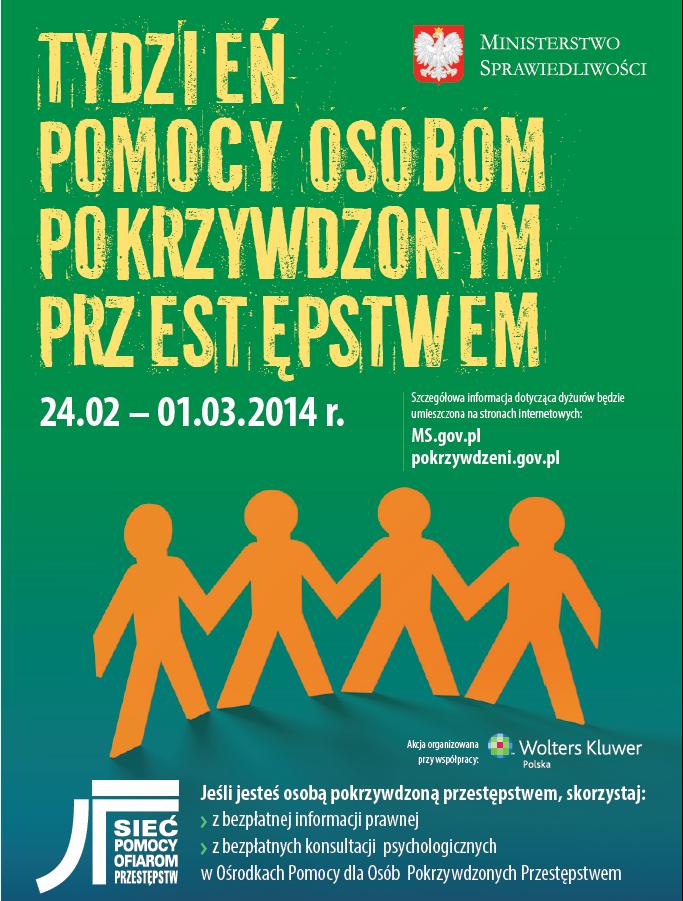 Wzorem lat ubiegłych Ministerstwo Sprawiedliwości organizuje w dniach 24 lutego – 1 marca 2014 roku „Tydzień Pomocy Osobom Pokrzywdzonym Przestępstwem”. Zasadniczym celem tej inicjatywy jest zwrócenie szczególnej uwagi na potrzeby i prawa osób pokrzywdzonych przestępstwem.
