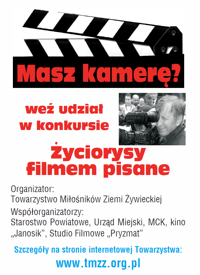 Zachęcamy do wzięcia udziału w konkursie organizowanym przez Towarzystwo Miłośników Ziemi Żywieckiej wraz ze współorganizatorami: Starostwem Powiatowym, Urzędem Miejskim, MCK, kino "Janosik", Studio Filmowe "Pryzmat". Szczegóły na stronie www.tmzz.org.pl
