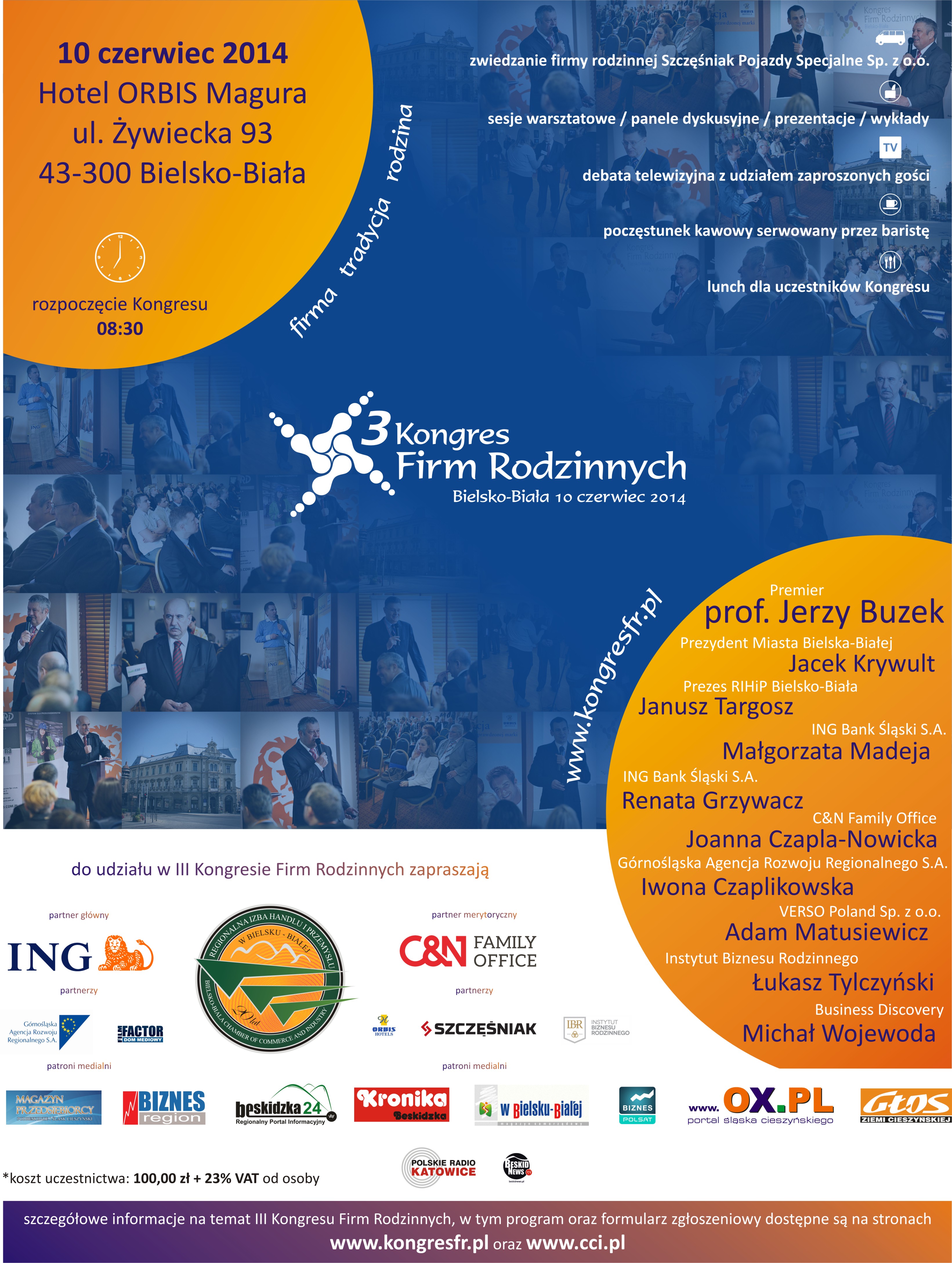 Regionalna Izba Handlu i Przemysłu w Bielsku-Białej ma przyjemność zaprosić wszystkich przedsiębiorców zainteresowanych tematyką firm rodzinnych, w szczególności tych prowadzących rodzinny biznes, do udziału w III Kongresie Firm Rodzinnych, który odbędzie się w dniu 10 czerwca br. (wtorek), w Hotelu ORBIS Magura w Bielsku-Białej, ul. Żywiecka 93.