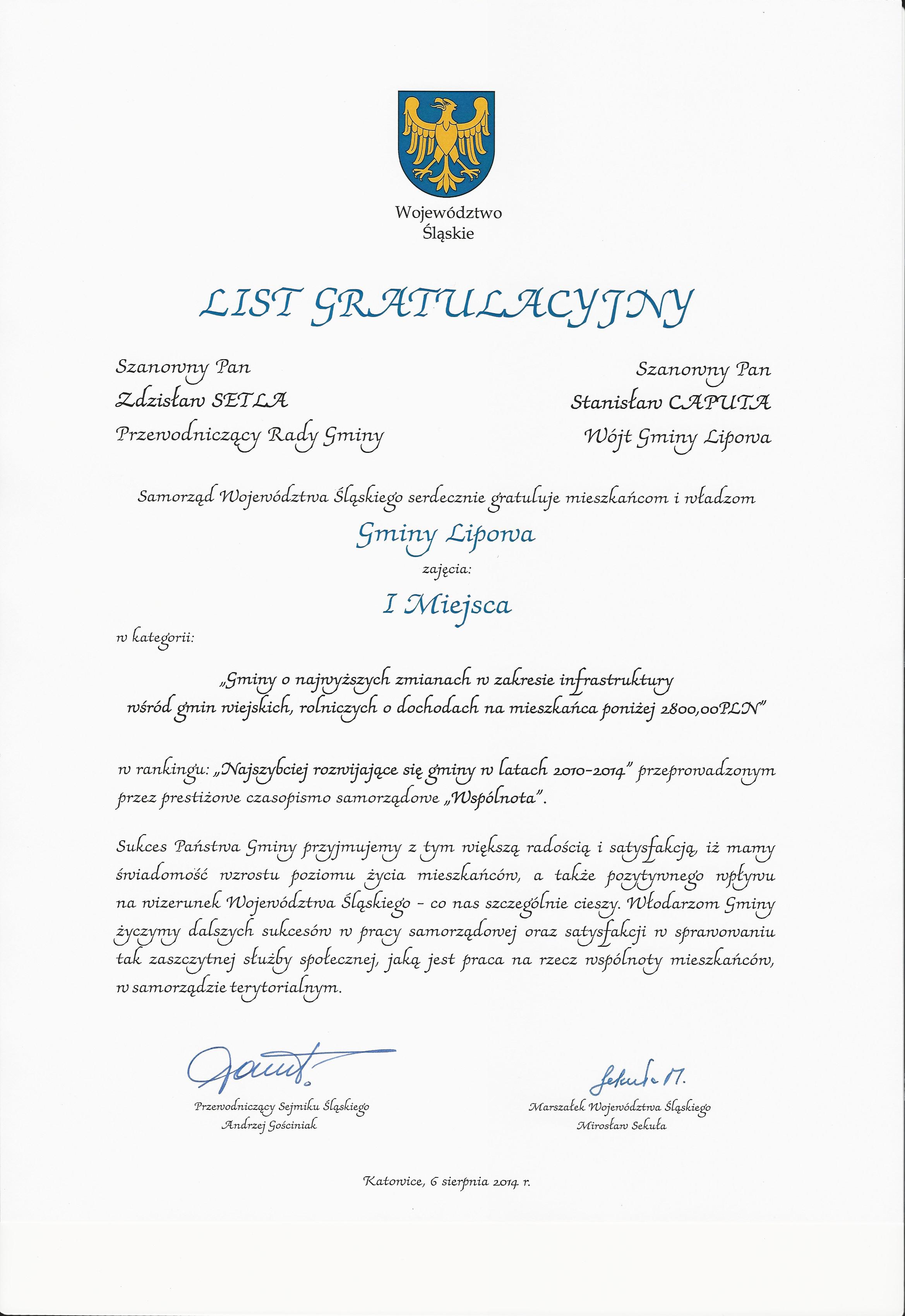 W Urzędzie Marszałkowskim Województwa Śląskiego, 6 sierpnia wręczono listy gratulacyjne dla gmin wyróżnionych w rankingu pisma samorządowego "Wspólnota". Wśród laureatów znaleźli się Wójt Gminy Lipowa Stanisław Caputa wraz z Przewodniczącym Rady Gminy Zdzisławem Setlą.