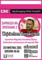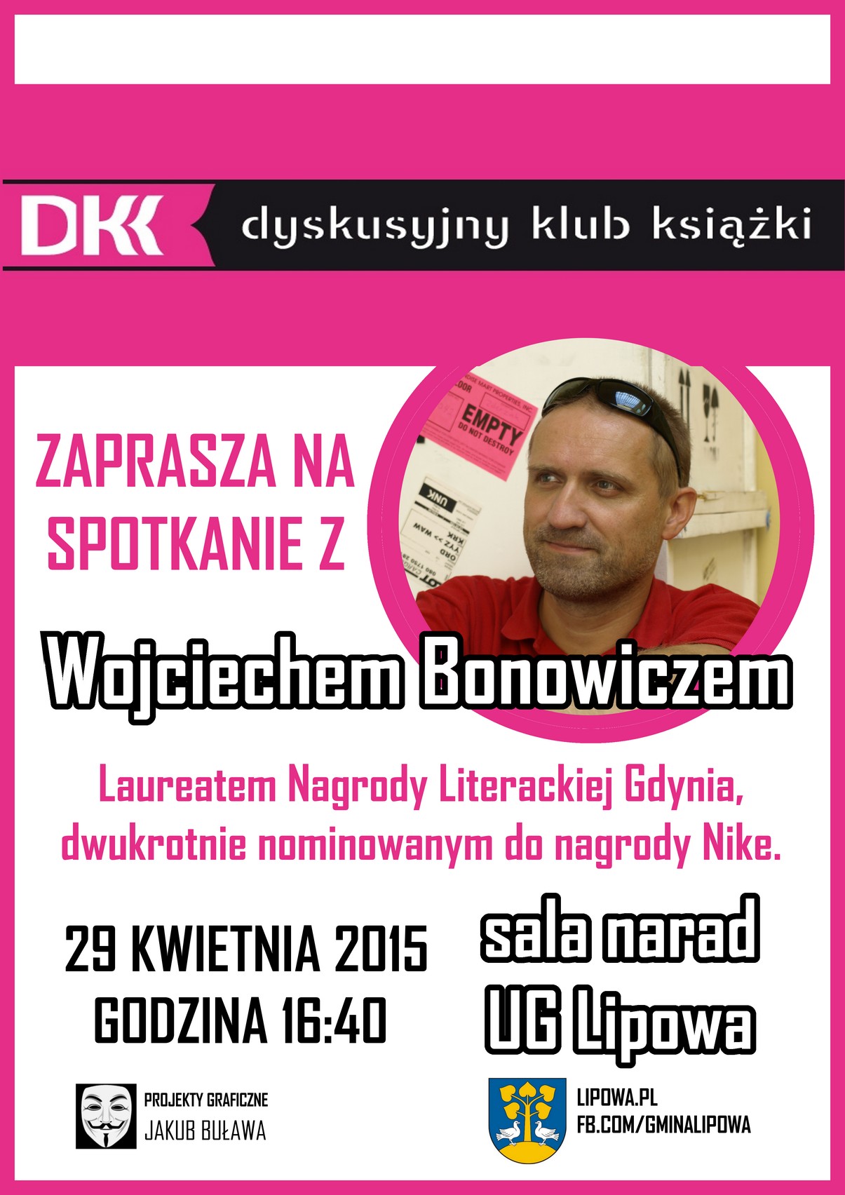 W środę 29 kwietnia, o godz. 16:40, w sali narad Urzędu Gminy Lipowa, w ramach Dyskusyjnego Klubu Książki, odbędzie się pierwsze spotkanie autorskie. Gościem będzie Wojciech Bonowicz. Poeta, publicysta, dziennikarz (związany m.in. z "Tygodnikiem Powszechnym"), dwukrotnie nominowany do nagrody Nike. W 2012 roku odznaczony Srebrnym Krzyżem Zasługi "za osiągnięcia w działalności społecznej oraz wydawniczej".