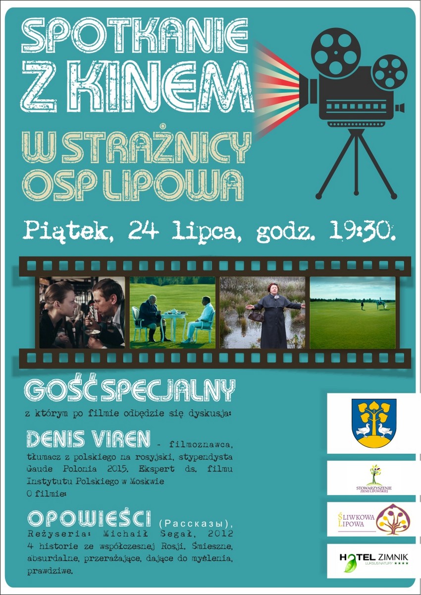 Już w piątek, 24-go lipca, o godz.20 w strażnicy OSP w Lipowej odbędzie się pokaz rosyjskiego filmu "Opowieść". W spotkaniu uczestniczyć będzie gość specjalny, prosto z Moskwy: Denis Viren - filmoznawca, tłumacz z polskiego na rosyjski, stypendysta Gaude Polonia 2015. Były ekspert do spraw kinematografii w Instytucie Polskim w Moskowie. O filmie: Opowieści (Рассказы), Reżyseria: Michaił Segał, 2012. 4 historie ze współczesnej Rosji. Śmieszne, absurdalne, przerażające, dające do myślenia, prawdziwe.