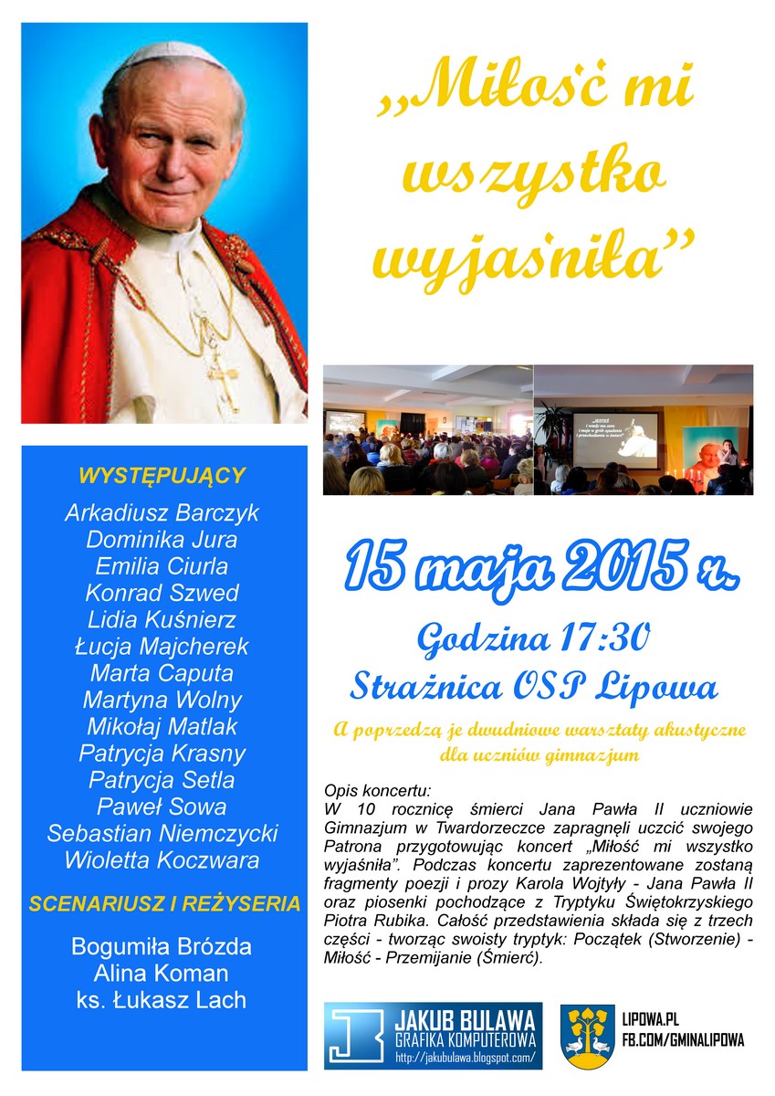 W 10 rocznicę śmierci Jana Pawła II uczniowie Gimnazjum w Twardorzeczce zapragnęli uczcić swojego Patrona przygotowując koncert „Miłość mi wszystko wyjaśniła”. Ten koncert, a właściwie inscenizacja słowno- muzyczna, wszystkim bardzo się spodobała i postanowiono powtórzyć to wydarzenie w samym centrum Gminy Lipowa, tym razem otwarte dla wszystkich. Podczas koncertu zaprezentowane zostaną fragmenty poezji i prozy Karola Wojtyły - Jana Pawła II oraz piosenki pochodzące z Tryptyku Świętokrzyskiego Piotra Rubika. Całość przedstawienia składa się z trzech części - tworząc swoisty tryptyk: Początek (Stworzenie) - Miłość - Przemijanie (Śmierć).