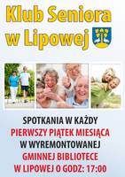 Spotkanie Klubu Seniora odbędzie się w pierwszy piątek miesiąca o godz. 17 w Gminnej Bibliotece Publicznej w Lipowej. Poza spotkaniem zapraszamy na kolejny wyjazd. Tym razem wybieramy się do Kina Janosik na film pt. "Panie Dulskie" w reżyserii Filipa Bajona. Wyjazd odbędzie się we wtorek, 10 listopada, ok godz. 16:20 z naszej gminy. Całkowity koszt wyjazdu to 5zł. Zapisy do wyczerpania miejsc: pod nr kom- 667 947 854 / w Urzędzie Gminy u Pana Szymona Wróbla.