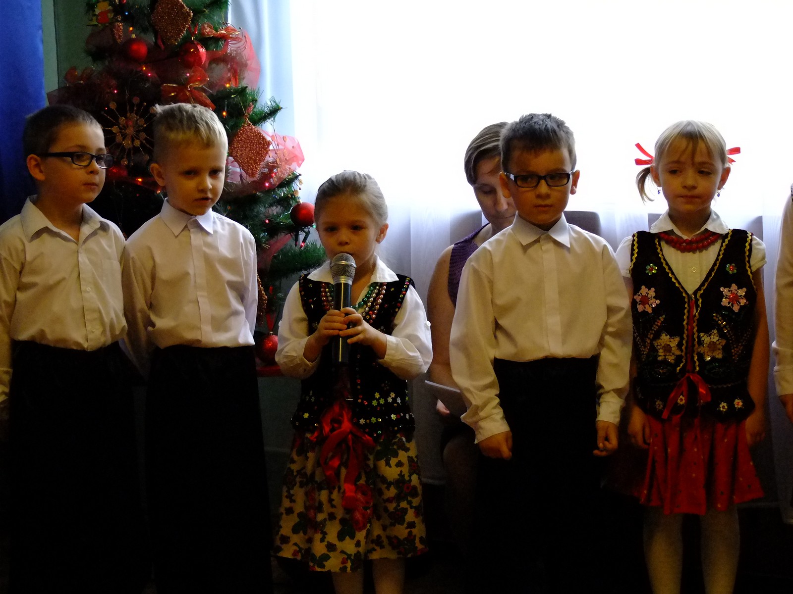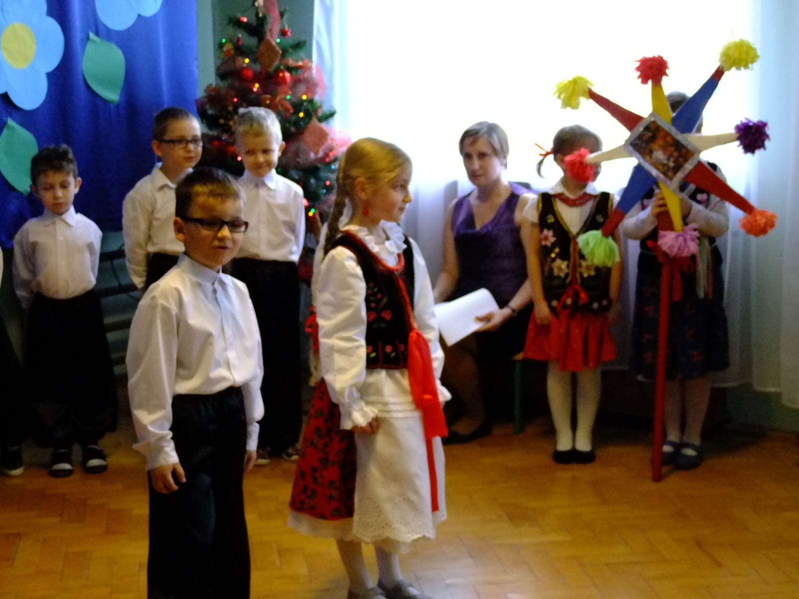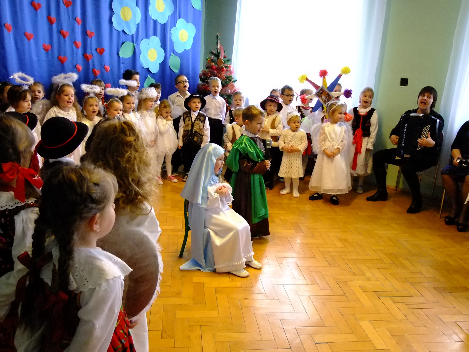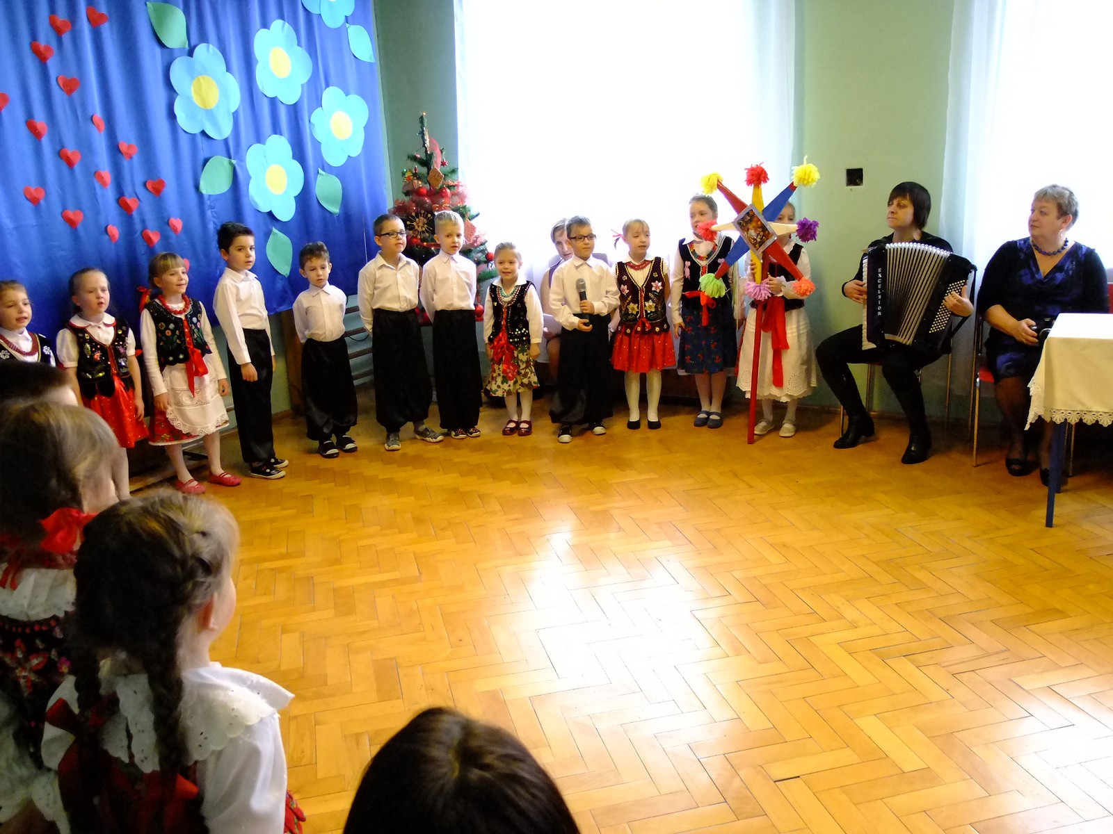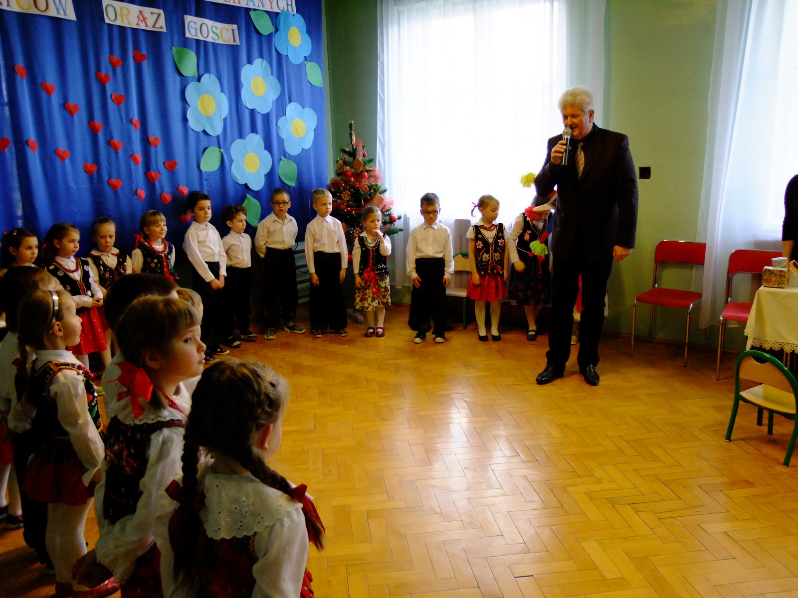 Grupa starsza przedstawiła program pt. "Kolędowanie", w którym złożyli po góralsku życzenia oraz śpiewali góralskie przyśpiewki przy akompaniamencie akordeonu Pani Katarzyny Jopek, która prowadzi w przedszkolu rytmikę. Grupa młodsza przedstawiła Jasełka, wspólnie z zaproszonymi gośćmi śpiewaliśmy kolędy. Na zakończenie grupa starsza zaśpiewała piosenkę po angielsku.