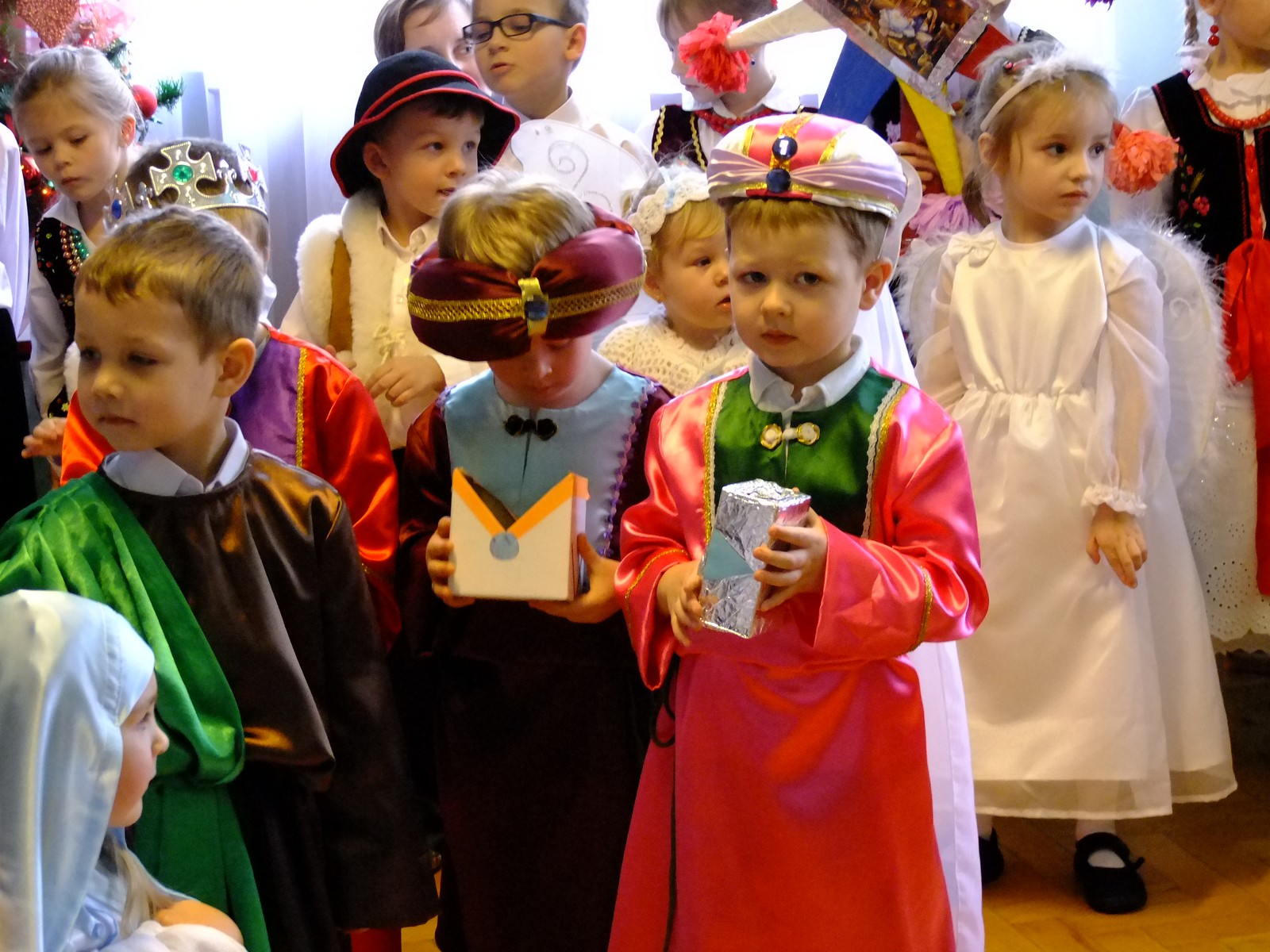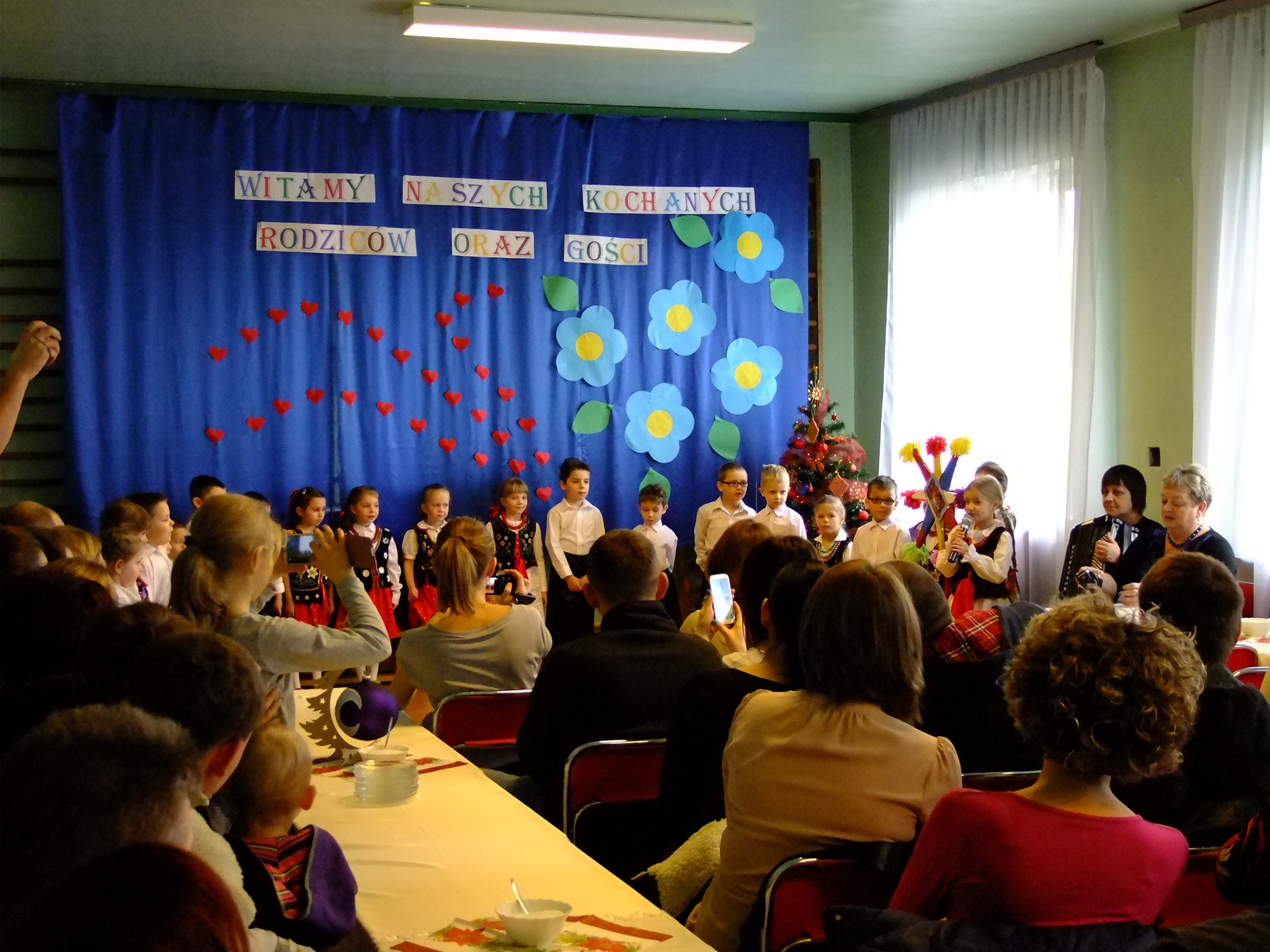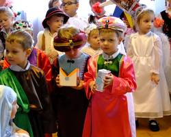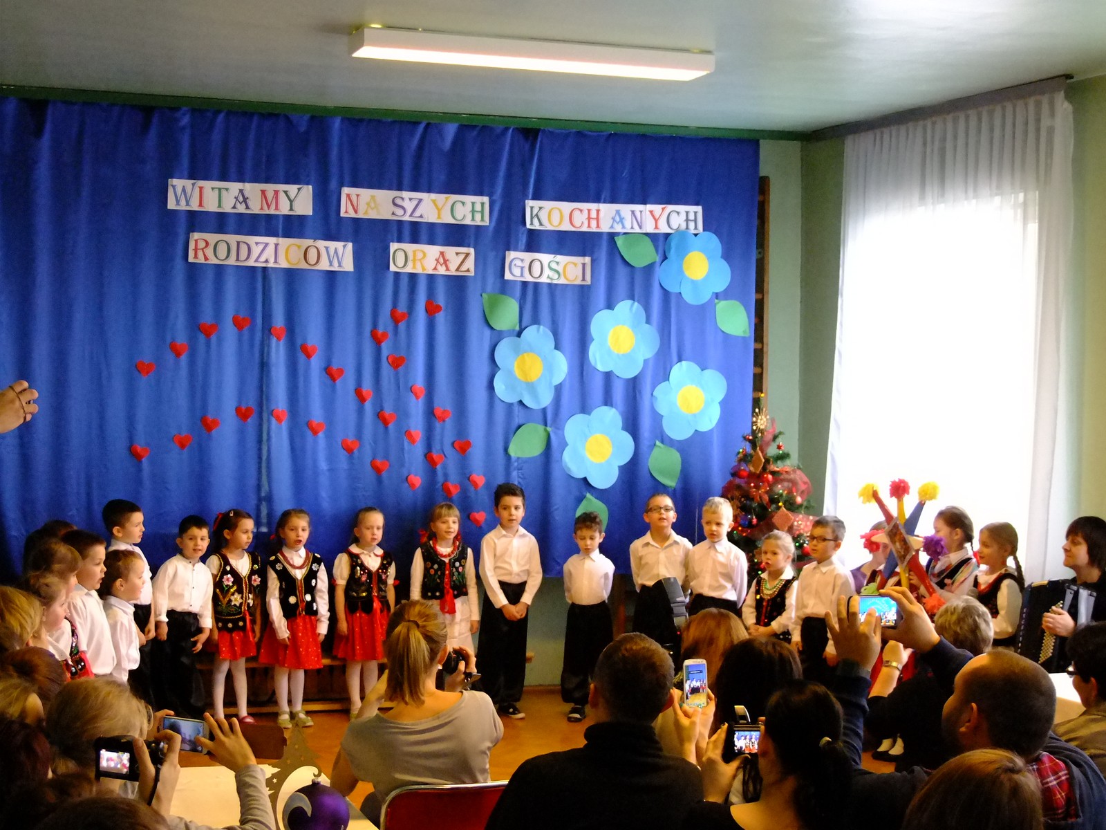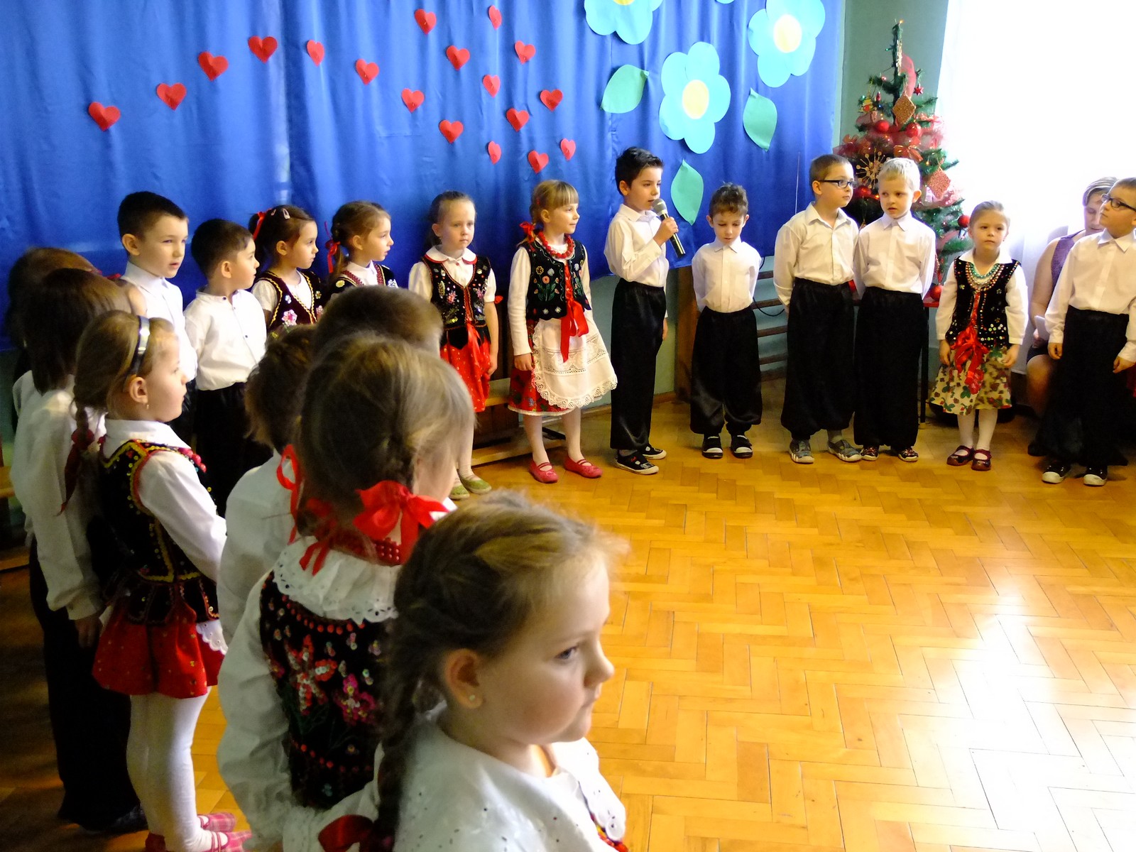 Grupa starsza przedstawiła program pt. "Kolędowanie", w którym złożyli po góralsku życzenia oraz śpiewali góralskie przyśpiewki przy akompaniamencie akordeonu Pani Katarzyny Jopek, która prowadzi w przedszkolu rytmikę. Grupa młodsza przedstawiła Jasełka, wspólnie z zaproszonymi gośćmi śpiewaliśmy kolędy. Na zakończenie grupa starsza zaśpiewała piosenkę po angielsku.