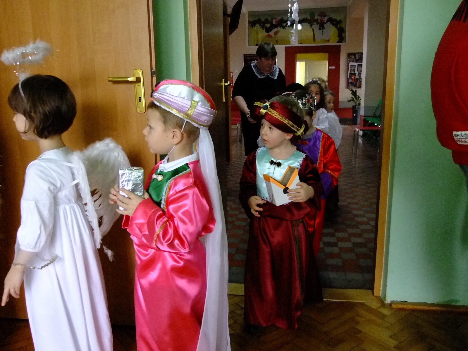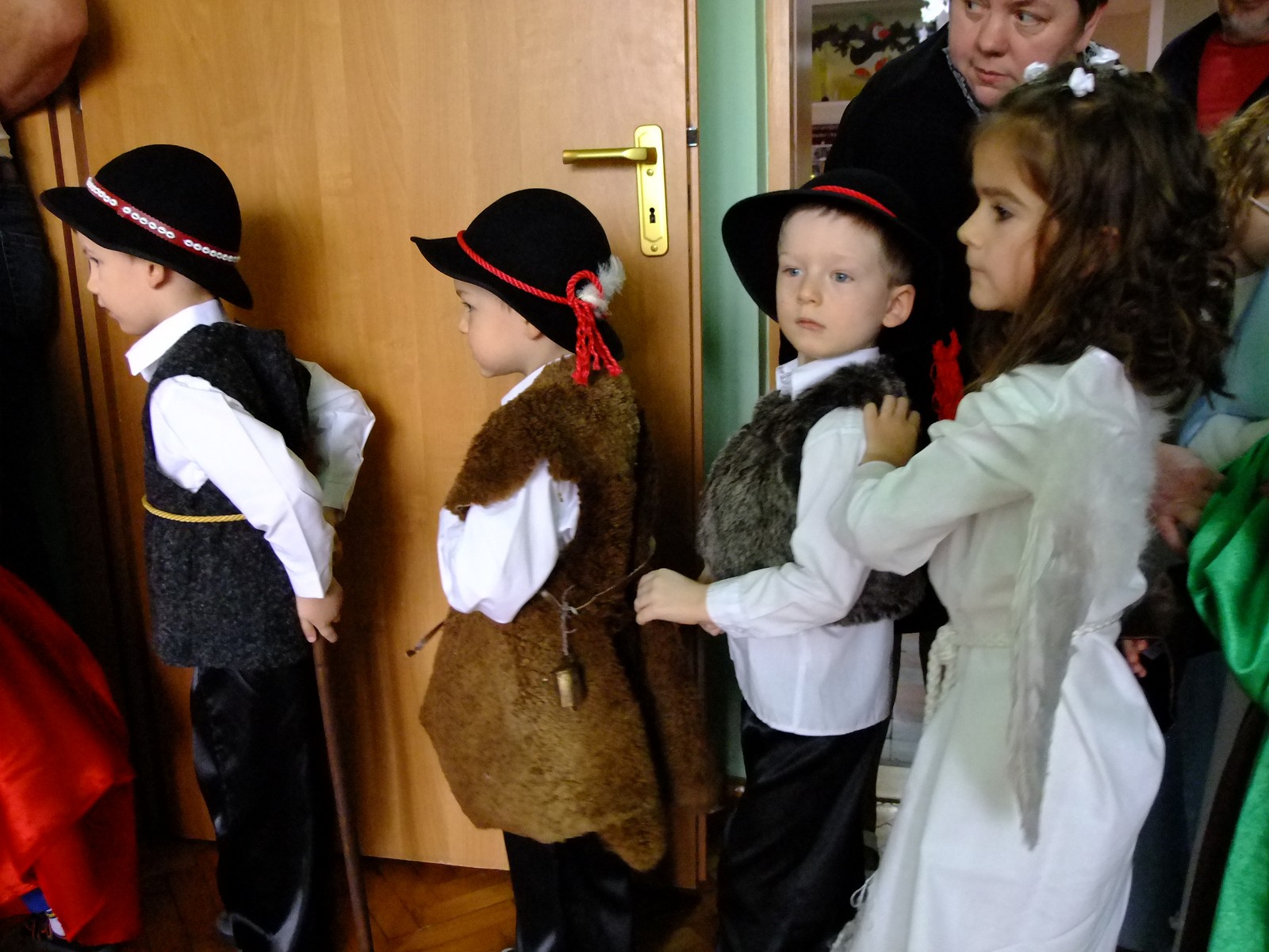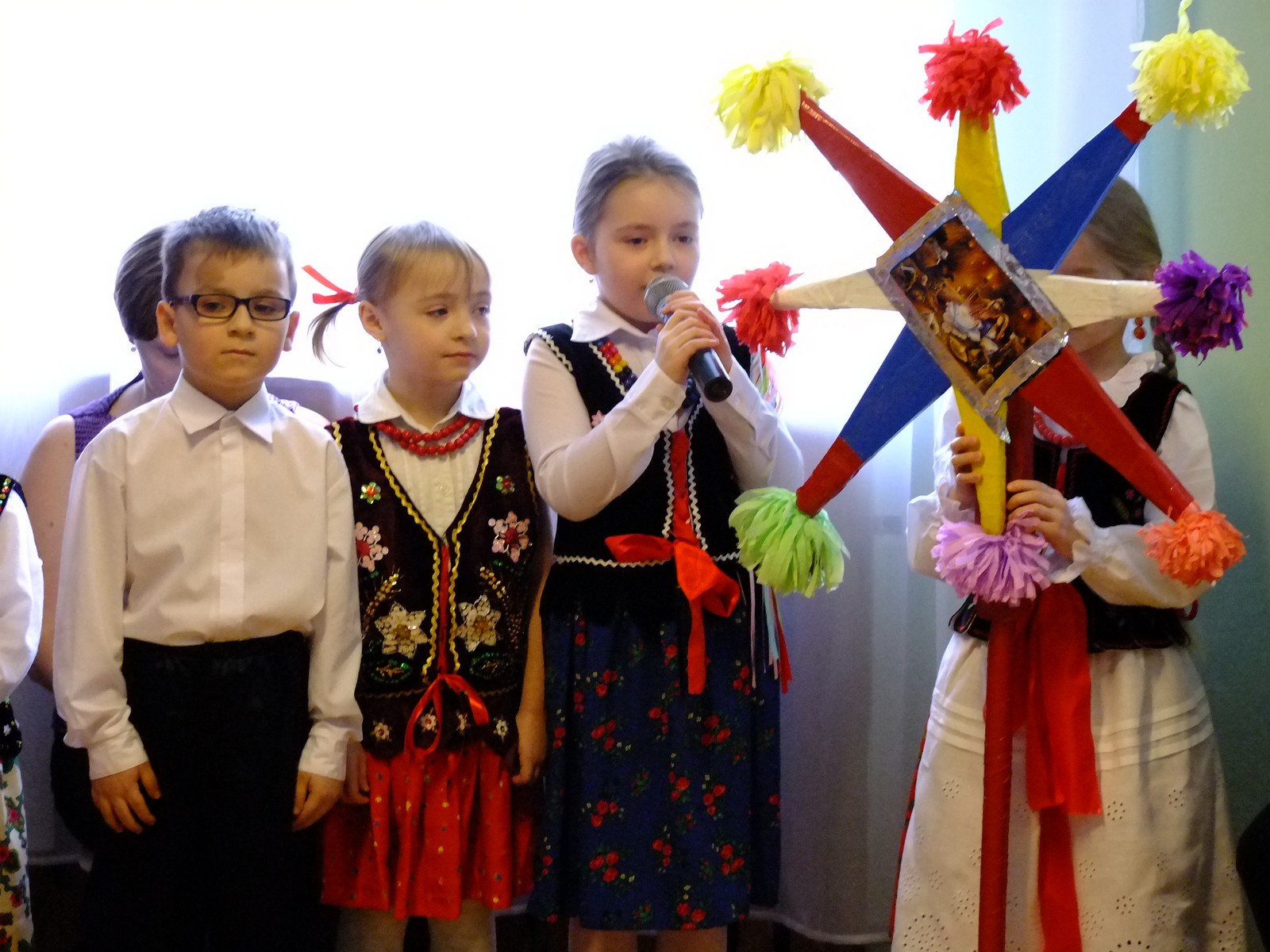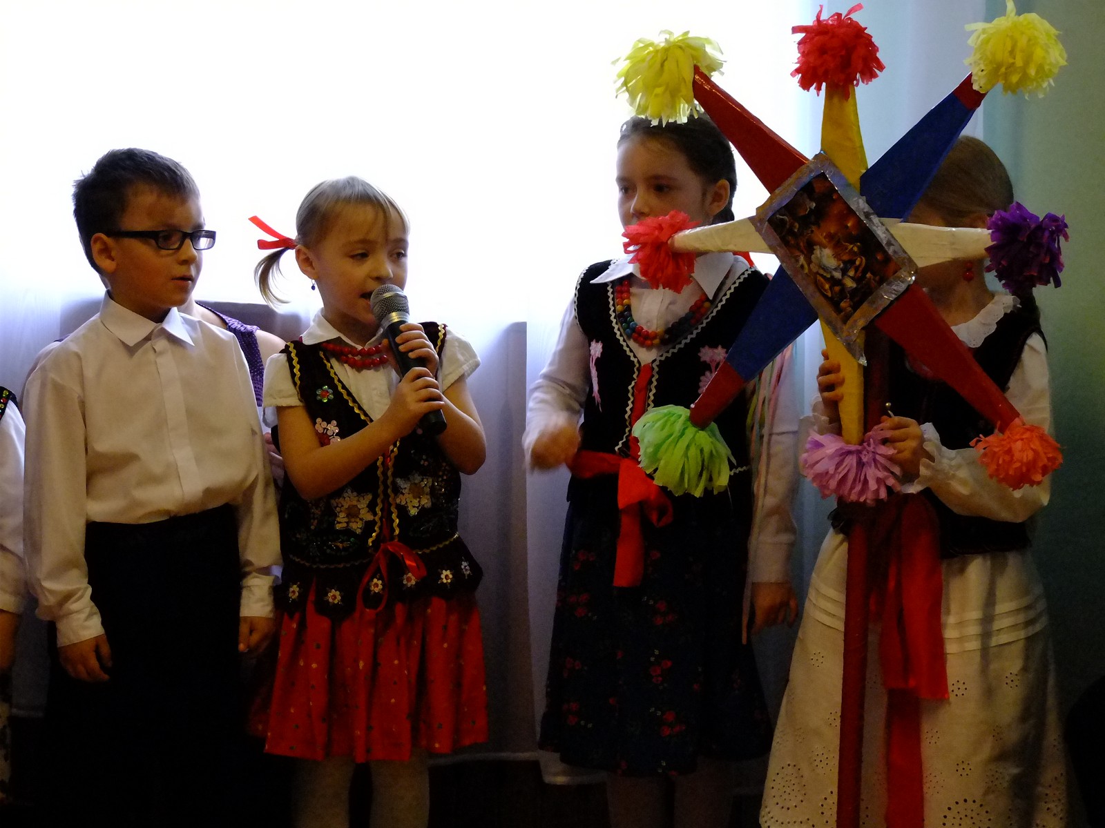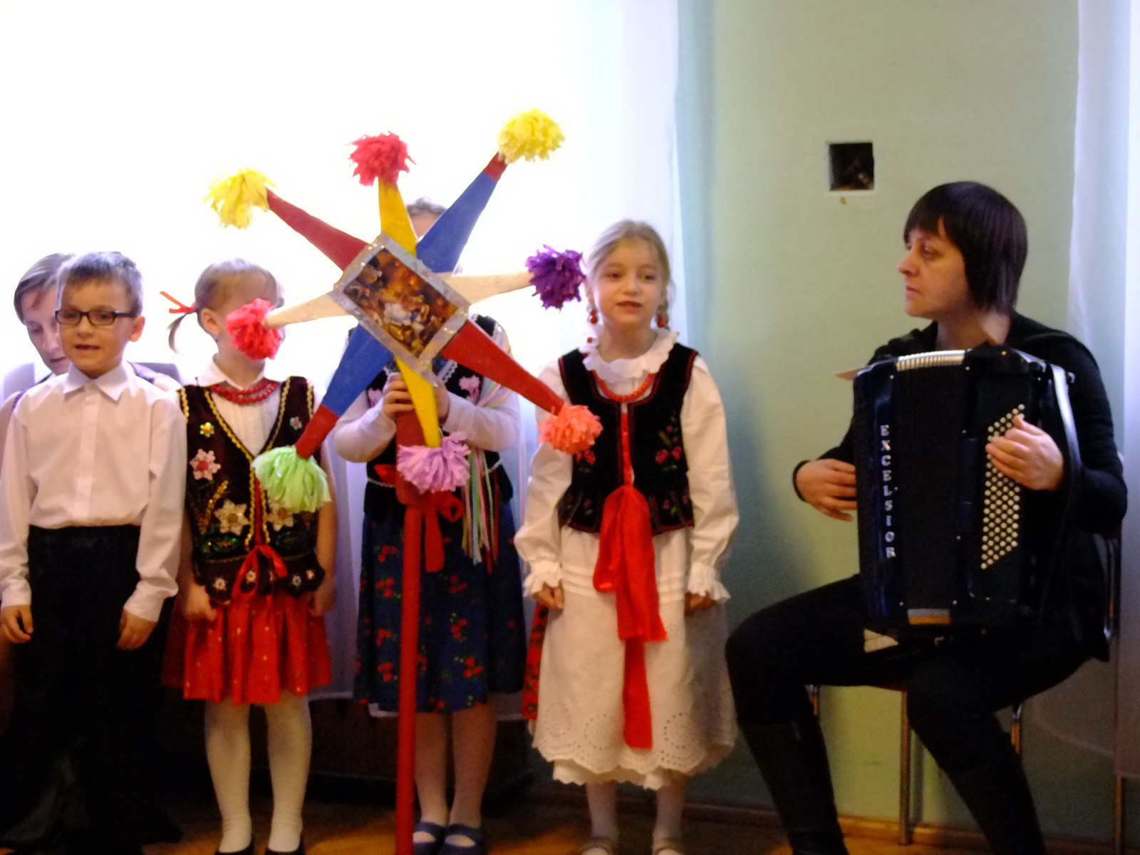 Grupa starsza przedstawiła program pt. "Kolędowanie", w którym złożyli po góralsku życzenia oraz śpiewali góralskie przyśpiewki przy akompaniamencie akordeonu Pani Katarzyny Jopek, która prowadzi w przedszkolu rytmikę. Grupa młodsza przedstawiła Jasełka, wspólnie z zaproszonymi gośćmi śpiewaliśmy kolędy. Na zakończenie grupa starsza zaśpiewała piosenkę po angielsku.
