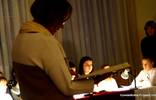 Nasza Jubilatka nie mogła u siebie pomieścić wszystkich, którzy chcieli ją uhonorować, dlatego postanowiliśmy salę gimnastyczną zamienić w przytulną kawiarenkę literacką, w której wysłuchaliśmy fragmentów ulubionych książek młodszego pokolenia m.in. Mikołajka, Koszmarnego Karolka, Dzieci z Bullerbyn, Muminków czy Noelki - jednej z serii książek M. Musierowicz, wszystkie one nawiązywały do tematyki zimowo-świątecznej.