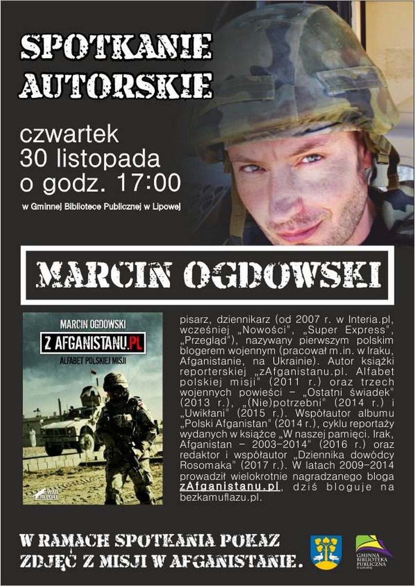 bloga zAfganistanu.pl, dziś bloguje na bezkamuflazu.pl. W ramach spotkania pokaz zdjęć z misji w Afganistanie. Wstęp na wydarzenie