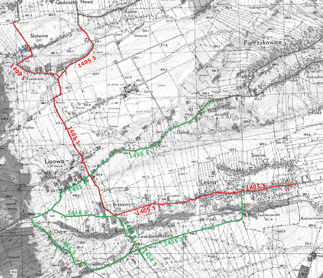 - S 1455 Pietrzykowice – Lipowa – Ostre – Twardorzeczka – Leśna dł. 11,700 km – IV standard