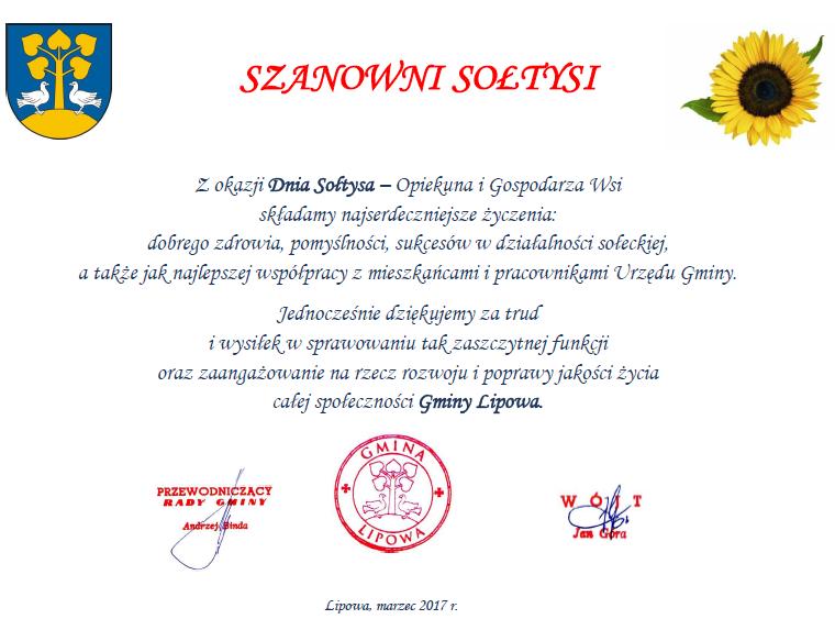 W dniu 10 marca 2017 roku w Urzędzie Gminy odbyło się spotkanie z sołtysami naszej gminy, podczas którego Wójt Gminy Lipowa - Jan Góra wraz z Przewodniczącym Rady Gminy Lipowa – Andrzejem Binda złożyli serdeczne życzenia z okazji Ogólnopolskiego Dnia Sołtysa przypadającego na 11 marca. Spotkanie było doskonałą okazją do dyskusji i przekazania informacji na tematy dotyczące działalności na rzecz lokalnych społeczności na terenie Gminy Lipowa.