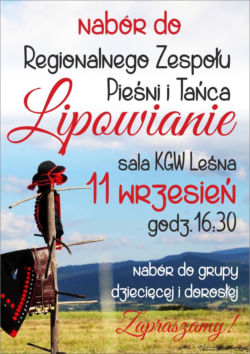 Nasz Regionalny Zespół Pieśni i Tańca Lipowianie, który otrzymał Grand Prix na 50. Wojewódzkim Przeglądzie Wiejskich Zespołów Artystycznych w Brennej w kategorii zespołów regionalnych, ogłasza nabór do sekcji dorosłej i dziecięcej. Wszystkich zainteresowanych piękną przygodą z folklorem serdecznie zapraszamy na spotkanie 11 września, o godz. 16:30 do Sali Koła Gospodyń Wiejskich Leśna! Znajduje się ona na rogu ul. Jagodowej i Św. M. Archanioła.
