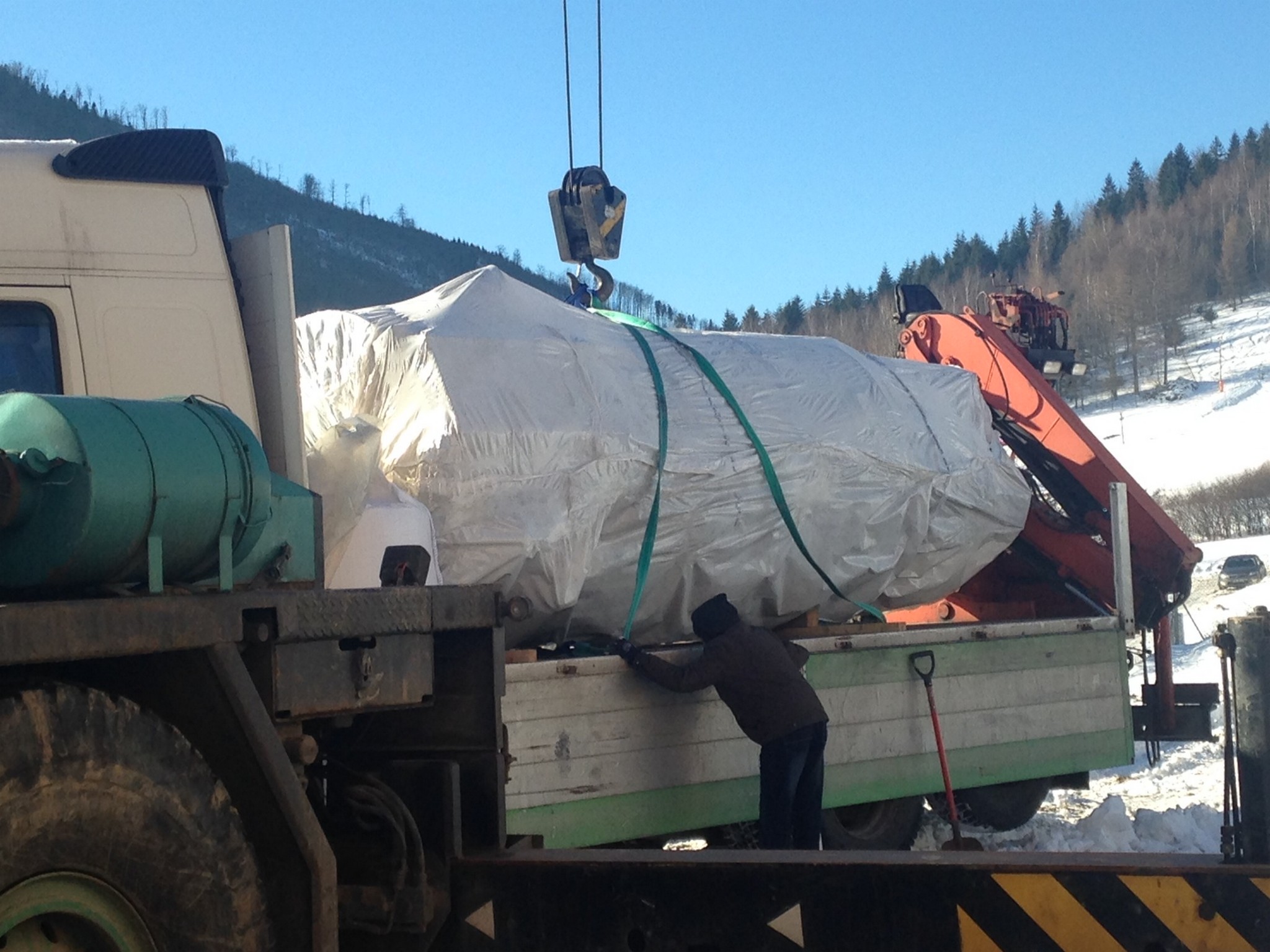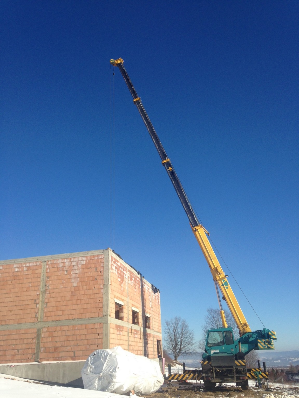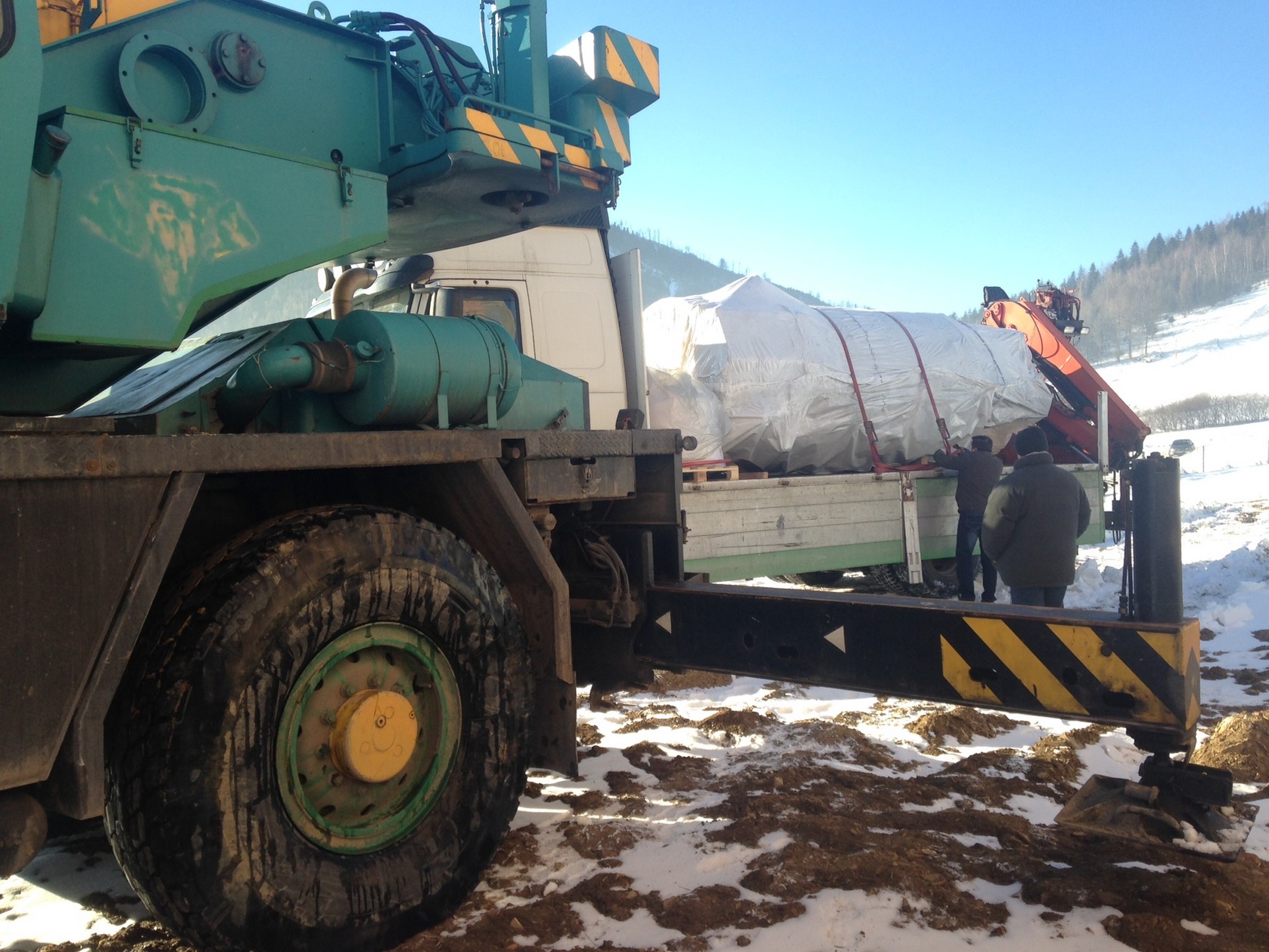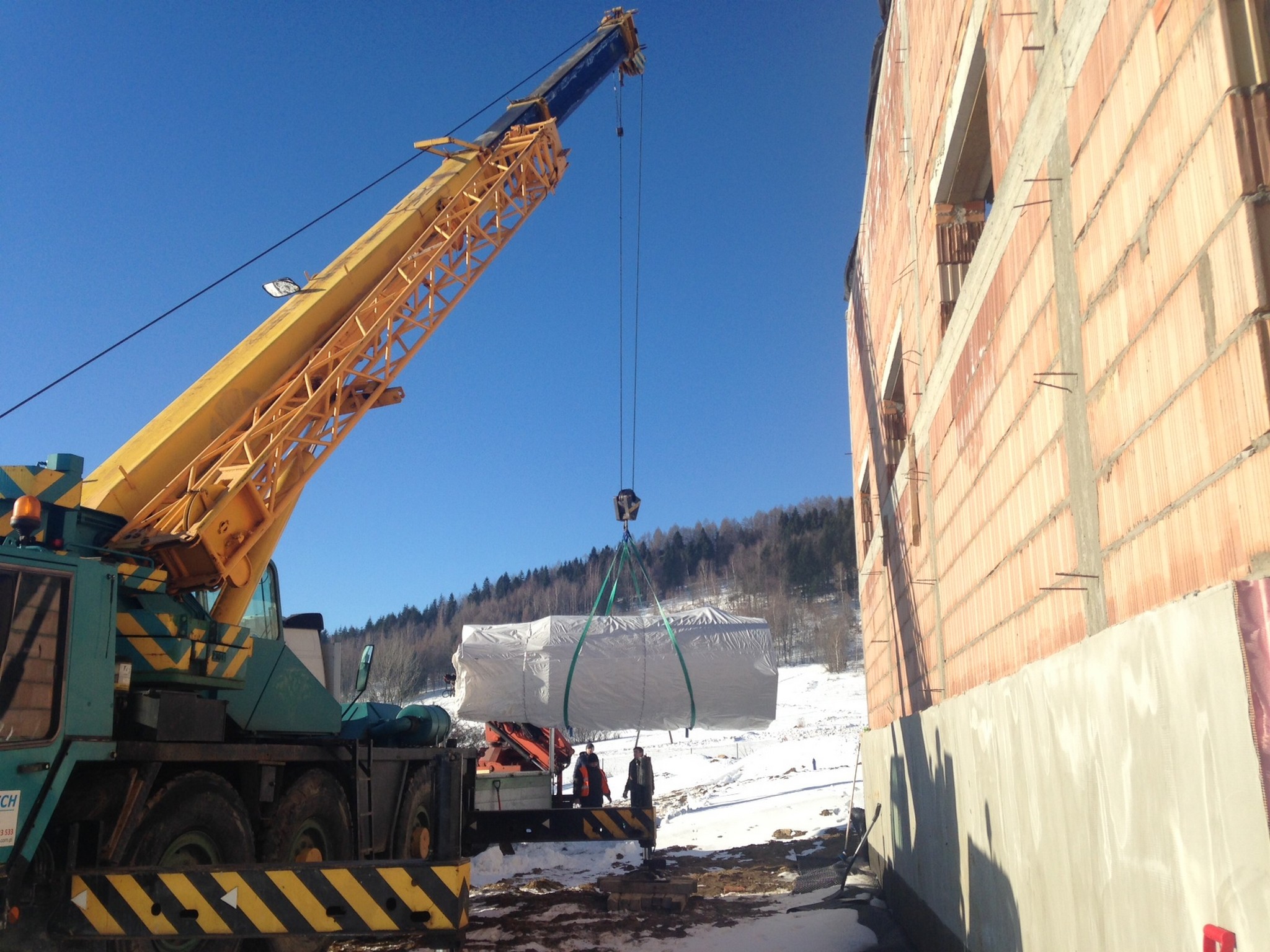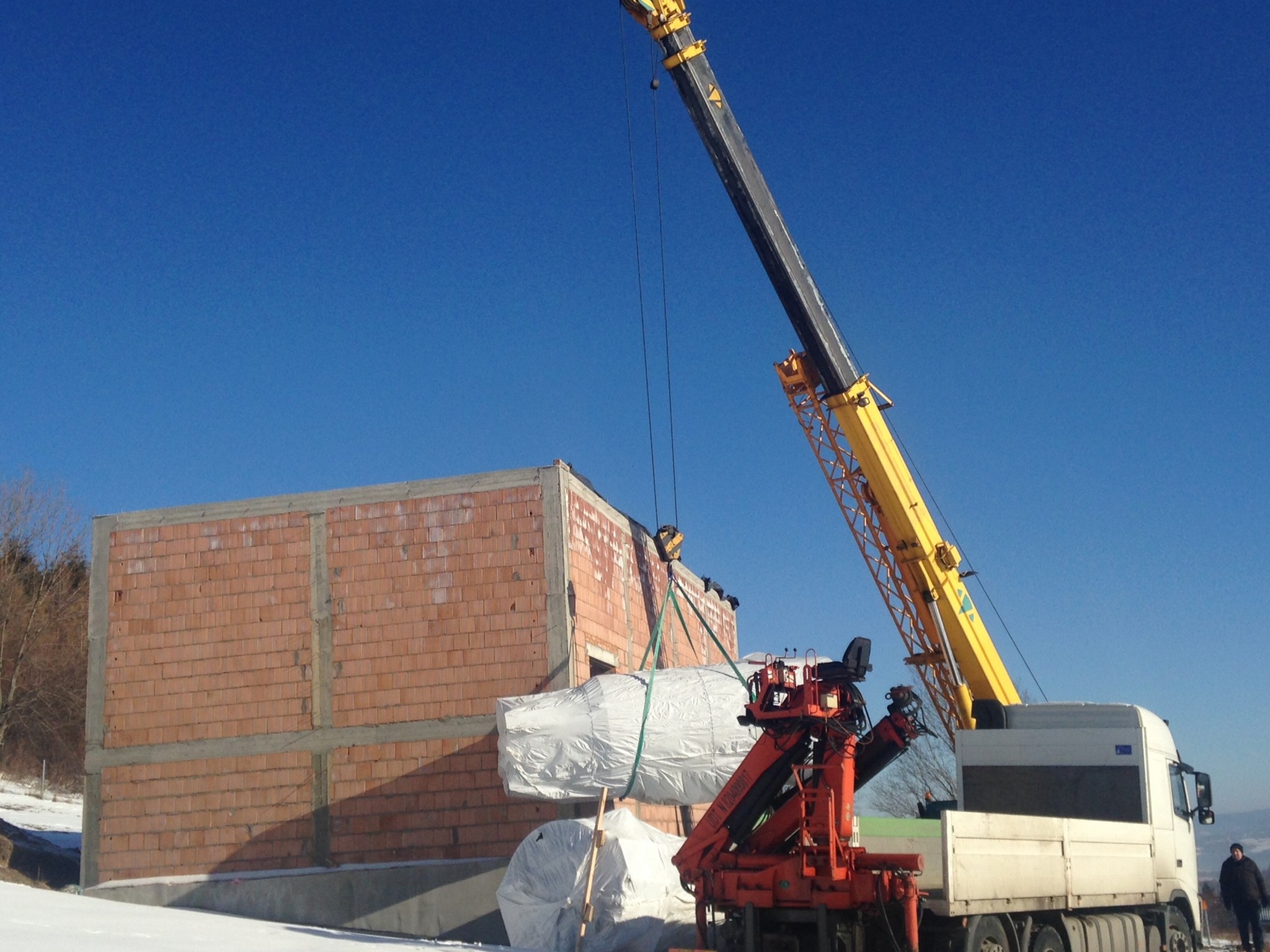 Rozpoczął się kolejny etap budowy naszego własnego ujęcia wody. Do wybudowanej wcześniej stacji uzdatniania wody przywiezione zostały blisko 2 tonowe filtry. Specjalny dźwig przez dach wkładał te elementy aparatury. W kolejnych dniach przywożone i montowane będą następne urządzenia. Ten etap zakończy budowa dachu.