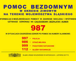 W Wojewódzkim Centrum Zarządzania Kryzysowego jak co roku działa bezpłatna infolinia dla osób bezdomnych o numerze telefonu 987 (połączenia bezpłatne zarówno z telefonów komórkowych, jak i stacjonarnych), pod którym można uzyskać informację o możliwości pomocy w zakresie noclegu i wyżywienia. Infolinia będzie funkcjonować całodobowo, w każdym dniu tygodnia i obejmować swym zasięgiem teren województwa śląskiego.