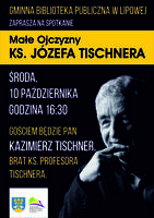 Gminna Biblioteka Publiczna w Lipowej zaprasza w środę, 10 października, o godz. 16:30 na spotkanie pt. „Małe Ojczyzny ks. Józefa Tischnera”. Gościem będzie Pan Kazimierz Tischner, brat ks. Profesora – prezes Stowarzyszenia „Drogami Tischnera”, które rok temu zostało laureatem Europejskiej Nagrody Obywatelskiej.