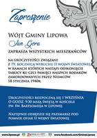 Wójt Gminy Lipowa Jan Góra, zaprasza wszystkich mieszkańców na uroczystości związane z 79. rocznicą wybuchu II Wojny Światowej w ramach których nastąpi odsłonięcie tablicy ku czci pamięci naszych rodaków zamordowanych przez Niemców 18 stycznia 1940r. Uroczystości rozpoczną się 1 września o godz. 9:30 mszą świętą w kościele pw. Św. Bartłomieja w Lipowej. Następnie odbędzie się przemarsz pod pomnik ofiar II Wojny Światowej.