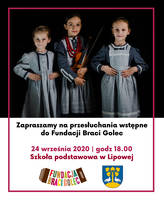 W czwartek, 24 września, o godz 18.00 w Zespole Szkolno- Przedszkolnym w Lipowej odbędzie się kolejne przesłuchanie do Fundacji Braci Golec. Chętnych do udziału w przesłuchaniu prosimy o przygotowanie do zaśpiewania krótkiej piosenki. Do Fundacji Braci Golec mogą dołączyć osoby potrafiące grać na instrumentach oraz dzieci i młodzież chcący dopiero zacząć przygodę z muzyką. Szczegółowe informacje na temat przesłuchań oraz edukacji w Fundacji Braci Golec można uzyskać u koordynatora fundacji Rafała Bałasia, numer telefonu: 500488112